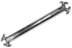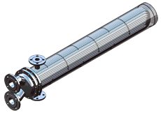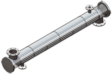 Geraderohrwärmetauscher (Typ WRG)Geraderohr-Konstruktionen können im Gegensatz dazu in den (geraden) Rohren gereinigt werden. Der Mantelraum ist normalerweise nicht zugänglich (Sonderkonstruktion nötig) und kann während der Reinigung unter Druck belassen werden. Bei grossen Temperaturunterschieden von Primär- zu Sekundärmedium sind (teure) Kompensatoren notwendig. |