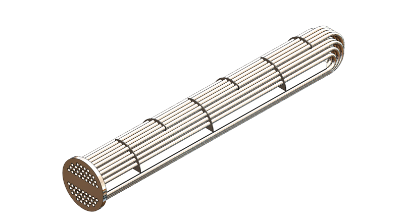 U- Rohrbündelwärmetauscher (Typ WRU)U-Rohre können nur von aussen gereinigt werden (Mantelraum). Dazu muss das Register normalerweise ausgezogen werden und die Medien müssen auf beiden Seiten entleert werden. Vorteil: die U-Rohre können sich auch bei hohen Temperaturunterschieden vom Primärmedium zum Sekundärmedium frei ausdehnen. |