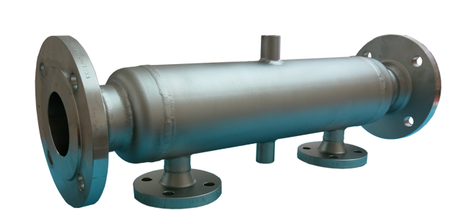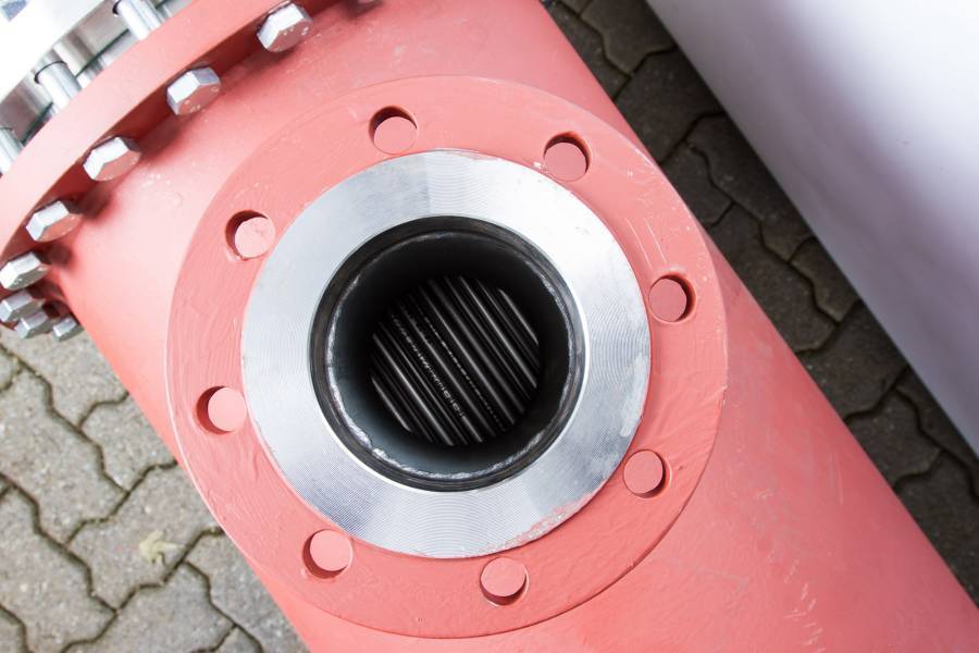 Vollverschweisster Rohrbündelwärmetauscher für Gas-Wasser Anwendung, direkt in die Gasleitung eingebaut.
